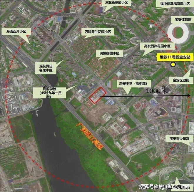 该地块位于宝中西侧,是宝中最后一个发展板块,具体位置在金科路与罗田路交汇处西南侧,北面是海韵学校、深航福利房深航假日名居,西面就是大铲湾,南面是湾区产业投资大厦,东面为新安中学(集团)高中部。