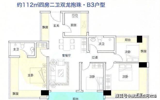 112㎡的4房2厅2卫(B3户型),设计的是竖厅双龙抱珠格局,进门独立入户玄关,餐客厅一体化设计,四开间朝南,全屋八面飘窗,主卧+1个次卧270°无柱转角飘窗,U型厨房,卫生间干湿分离,得房率约100%(包含赠送),客厅连接次卧出大阳台西南朝向。