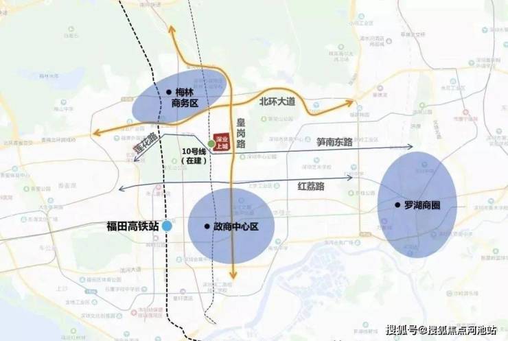 占据城市核芯区域,位居福田CBD北门户,南邻政商区,北与梅林商务区、深圳北站商务区无缝衔接,东承罗湖商圈,西瞰南山高新技术产业基地和前海自贸区。