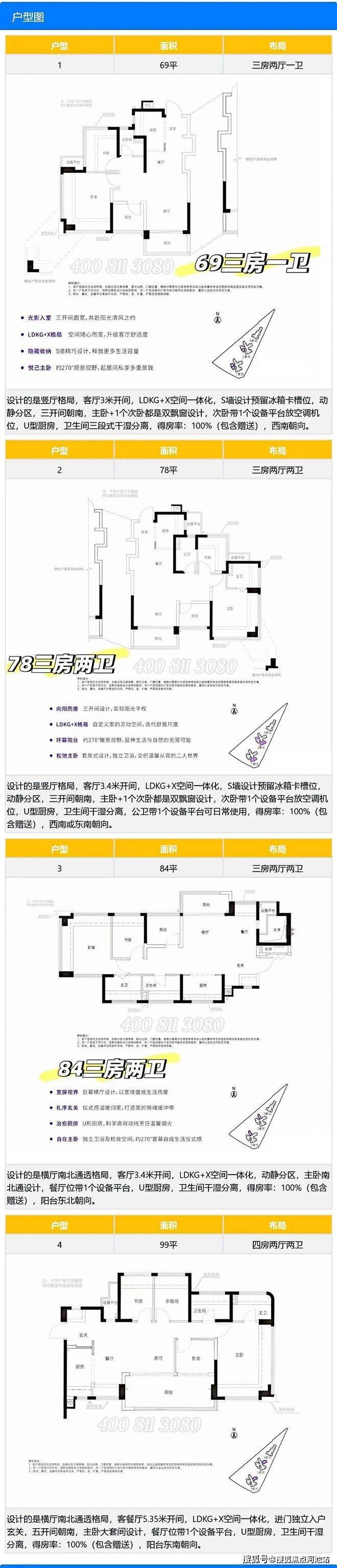 户型:约 69-99㎡ 3-4 房,户户朝南、新规高得房率