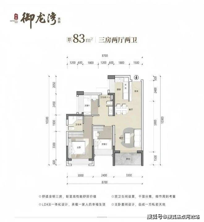 83㎡3房2卫,分布在2栋2单元03/04户型,设计的是竖厅格局,客厅开间3.3米,LDKB一体化设计,三开间朝南,U型厨房,公卫三段式分离设计,得房率约79.25%(不含赠送),东南或西南朝向,加上赠送得房率约89%