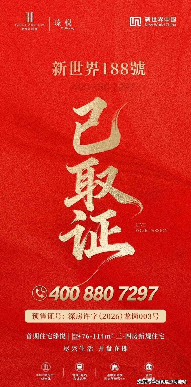 位于龙岗永湖地铁口附近的新楼盘——新世界新璟曜广场!推广名为:新世界188号,项目05地块“臻悦”已于2026年4月22日取证,定于4月底开盘入市,本次开盘推出的住宅面积有建面约76㎡的3房1卫,86㎡的3房2卫,98-114㎡的4房2卫,180㎡的5房3卫户型,目前营销中心,样板房已经开放,过来现场参观需提前拨打新世界188号楼盘开发商官方电话:400 880 7297(官方认证)中介勿扰!