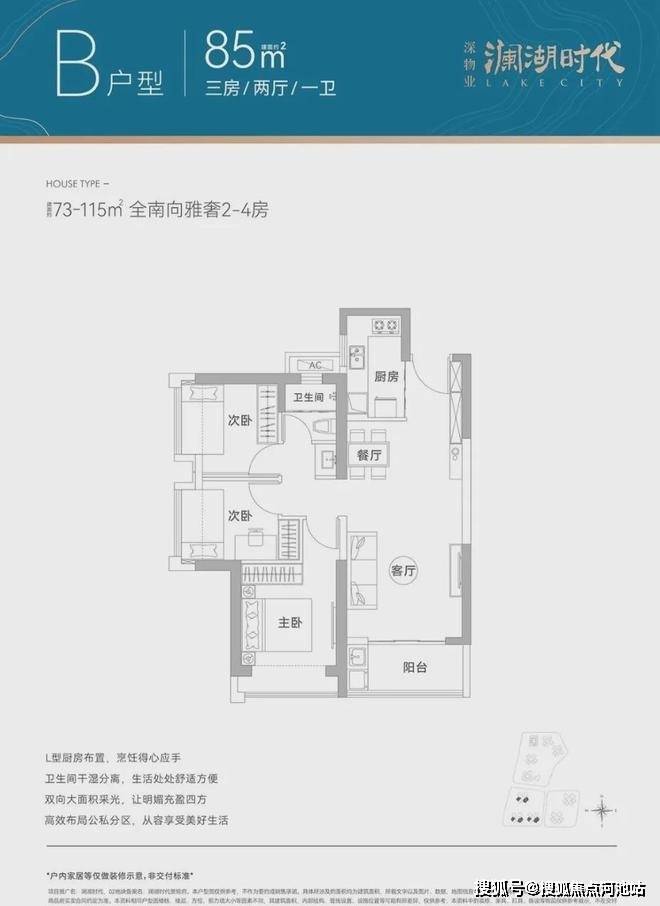 85㎡的3房2厅1卫,设计的是竖厅格局,客厅3.5米开间,LDKB一体化设计,3个卧室分别做到了3.1米/2.9米/2.5米的宽度,L型厨房,卫生间三段式分离,得房率77-78%(不含赠送),阳台西南或东南朝向。