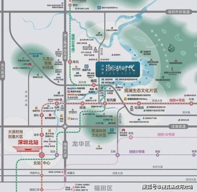 澜湖时代位于龙华桂花路和观光路交汇处的北面,正好处于“梅观创新产业走廊”和“观澜河生态走廊”两大都市走廊的交汇节点上,融汇“产业”与“生态”两大特色要素。