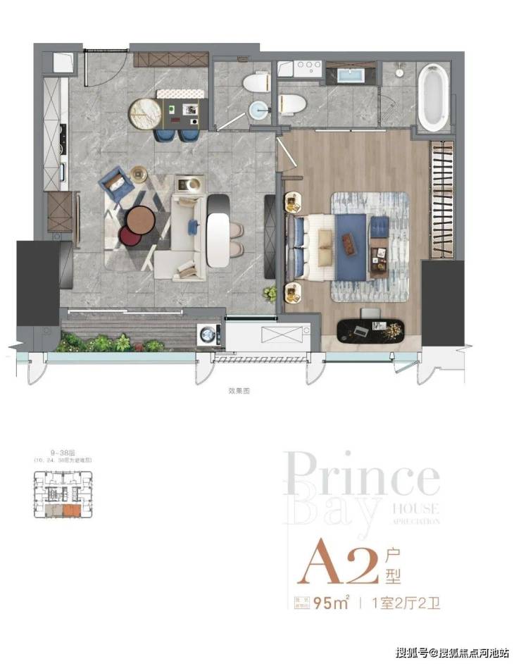 南向(9-38层) A2户型,95㎡ 1室2厅2卫,虽然卧室的衣柜空间少了,但是却却多了一个卫生间,还带浴缸!