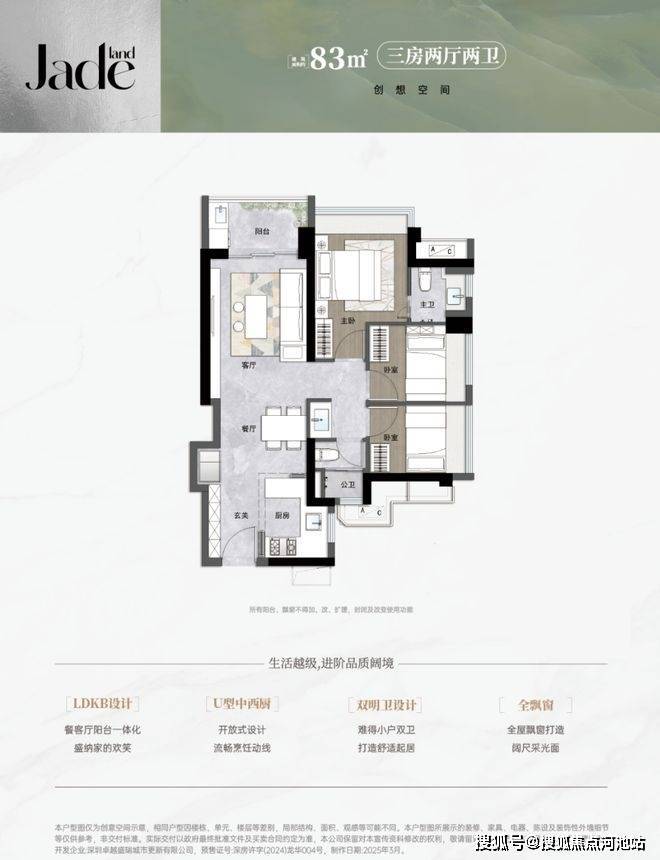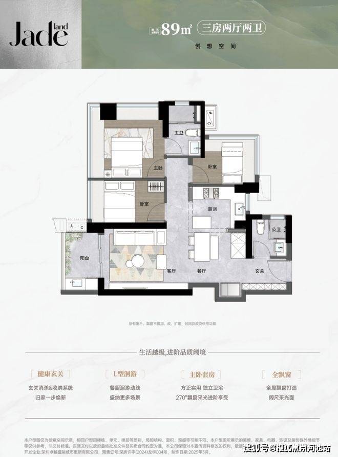 三开间朝南,主卧+次卧270°飘窗,西南/东南向采光优越。