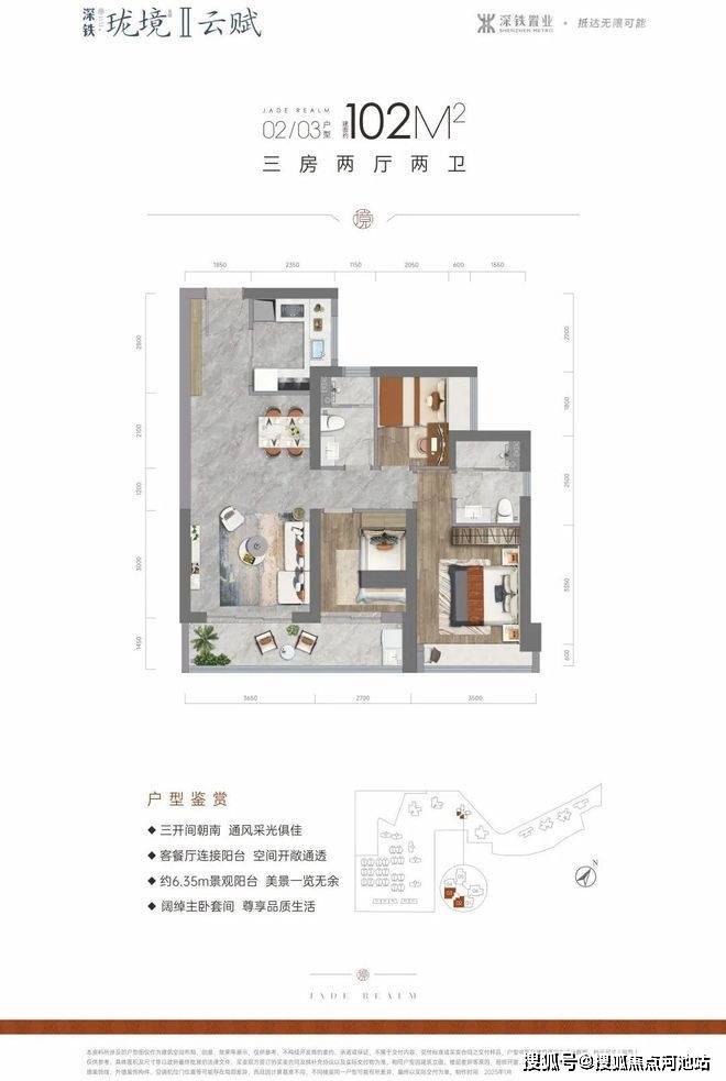 102㎡的3房2厅2卫,设计的是经典竖厅格局,进门入户玄关,客厅3.7米开间,LDKB一体化设计,动静分区,三开间朝南,客厅连接次卧出6.4米长的大阳台,U型厨房,卫生间干湿分离,得房率约75.41%(不含赠送),东南或西南朝向。