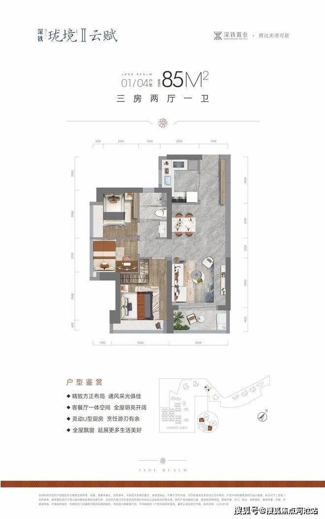 85㎡的3房2厅1卫,设计的是竖厅格局,进门入户玄关,客厅3.6米开间,LDKB一体化设计,动静分区,U型厨房,卫生间三段式分离,得房率约75.4%(不含赠送),西南或东南朝向。