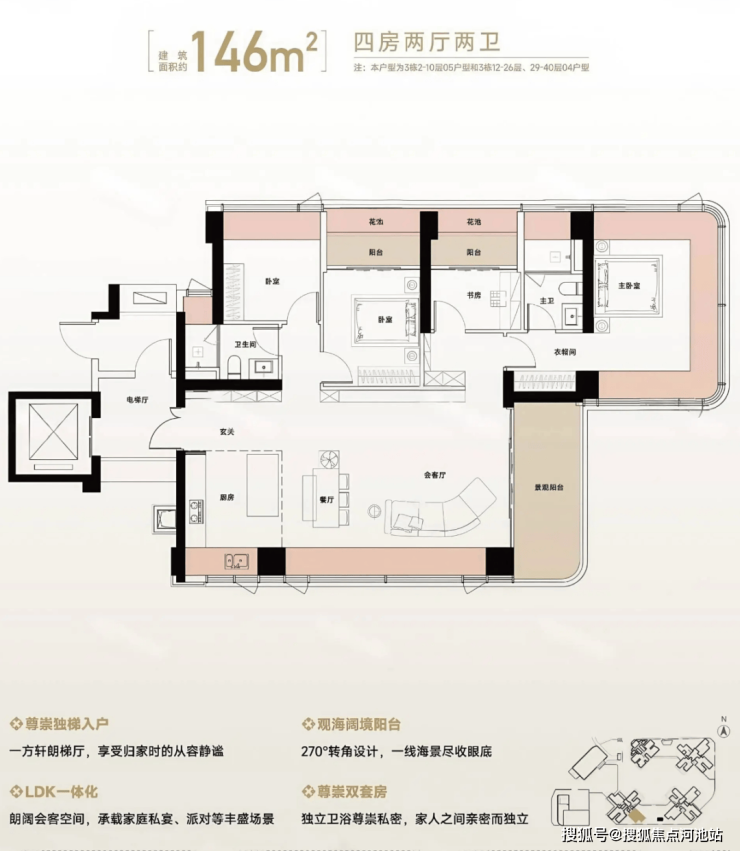 在平层户型当中,高区唯一东南朝向的户型,为约146㎡左右的大四房户型。四个房间,都可以花园内部景观,安静舒适,部分楼层户型的主卧,可以有机会两面看海兼顾看上。