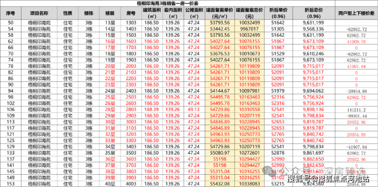 同户型上下楼层价差,少则8千多,1.6万左右,多则3到5万;不少上下楼层房源总价相等,比如16层和17层,20层到23层,25层和26层,30层和31层,32层和33层,36层和37层,38层和39层,同户型总价相同。