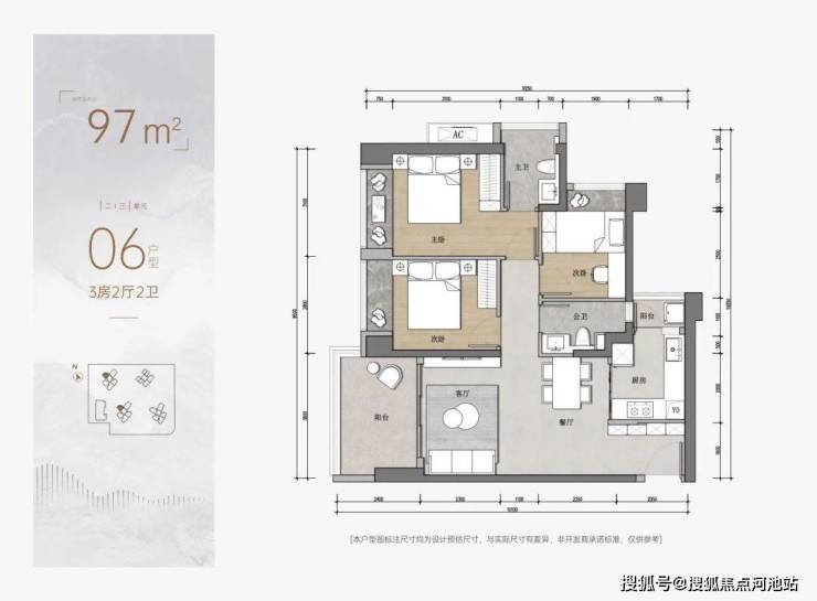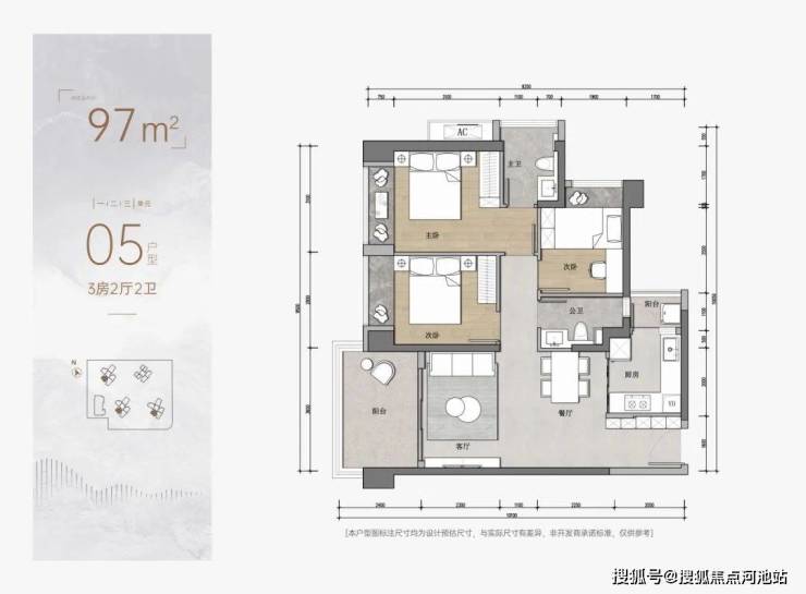 3房为97平3房2卫的户型,客厅开间做到了3.6m而且阳台还不是承重墙,也就是说咱们的客厅还能往外推一些,做一个更大的公区。阳台东南朝向可看小区园林景观,西南侧则可以看到南山的山景景观。采光及通风效果都是非常优质的。