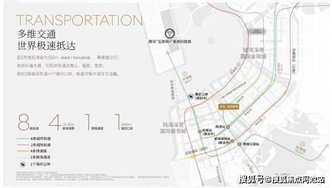 周边共规划6条地铁线、2条城际轨道、1条妈湾跨海隧道及1个海空口岸。距5号线妈湾站约550m,听海大道贯穿前海,可短时间通达南山、福田、宝安,快速链接大湾区生活圈。