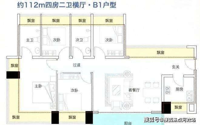 112㎡的4房2厅2卫(B1户型),设计的是横厅南北通透格局,进门入户玄关,餐客厅一体化设计,五开间朝南,全屋十面飘窗,主卧270°无柱转角飘窗,U型厨房,卫生间干湿分离,得房率约100%(包含赠送),客厅连接餐厅出大阳台西南朝向。