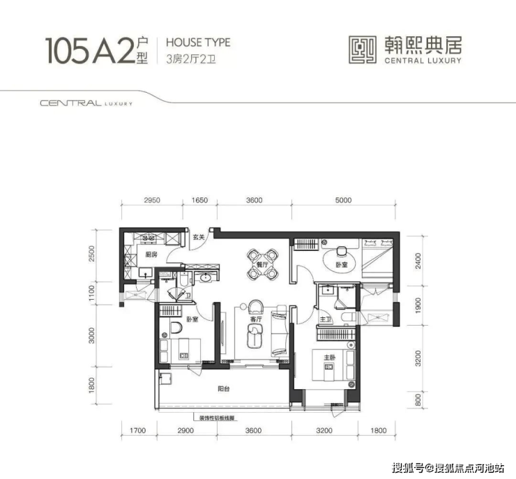 105A1户型,竖厅类双龙抱珠格局,客厅开间3.6米,阳台开间6.5米,尺度非常奢阔,U型厨房,公卫三段式分离。