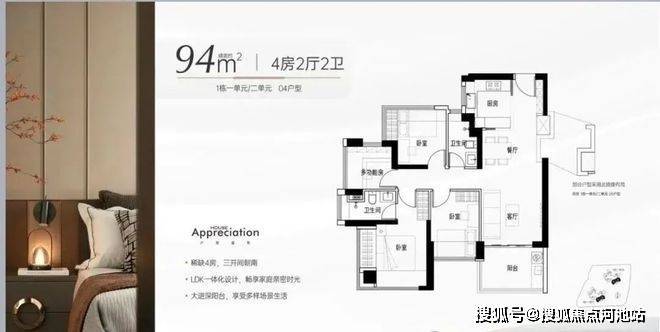 94㎡的4房2厅2卫,折后总价327万起,单价约3.47万/㎡起。