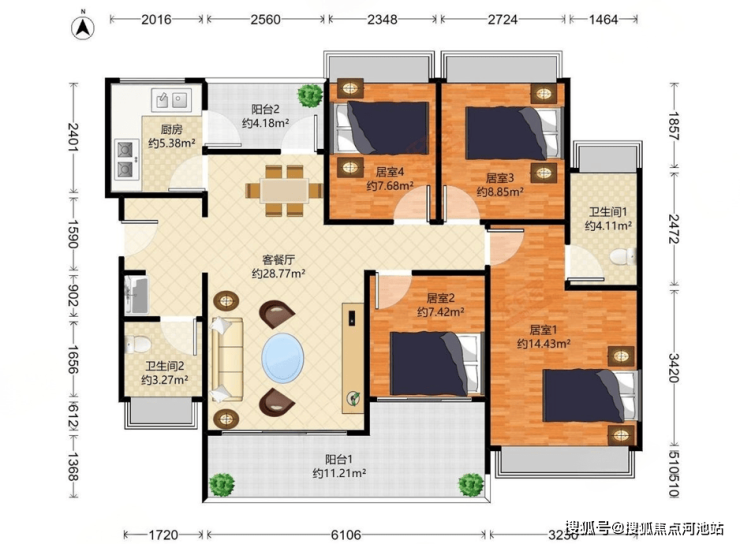 竖厅,4房2厅2卫,入户空间宽敞实用,客餐厅一体,阳台约11平,主卧套房设计。