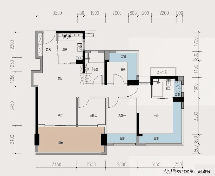 这个89平的E户型,应该是这次公布的三个户型里面赠送最多的一个户型了,从厨房到客厅到卧室到卫生间,全部都有凸窗。另外还有5.6米的大阳台,这个在89平的户型里面真的不多见,算是很奢侈了。总结一句话,飘窗利用好,我的得房率就吊打一切新房。