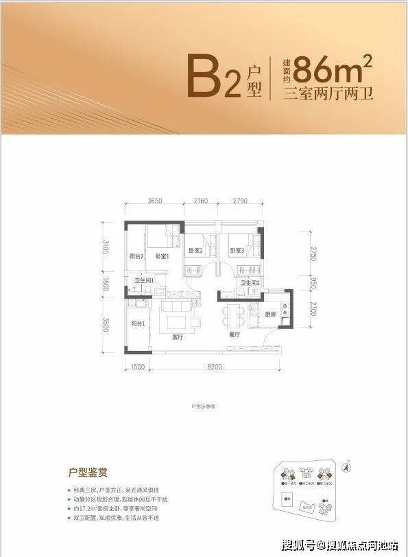 特点:LDKB一体化设计,主卧11.3㎡(含飘窗),次卧7.28㎡(含飘窗)x2。