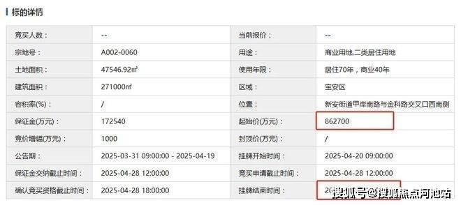 总用地约4.75万平,总建面超过27万㎡,容积率为5.7,起拍价86.27亿元。