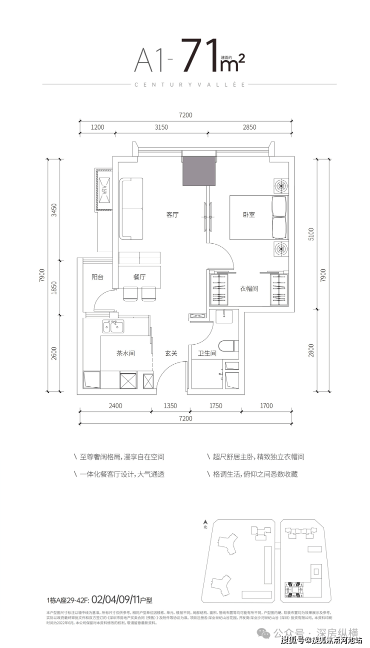 面积为67-71㎡1房卫,83-87㎡2房1卫,位于29-42F,5梯14户。