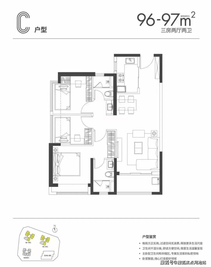 合正新悦项目推出可售住宅共834套,均精装交付,建面约77㎡-96㎡-119㎡2房-4房。