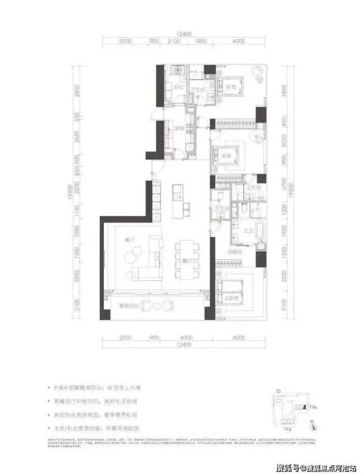 T1B栋D与T1A栋F户型格局相似,但是终于把“中央公卫”去掉了,换成吧台,明显协调了许多。东端头无遮挡,270°景观,适合看日出。
