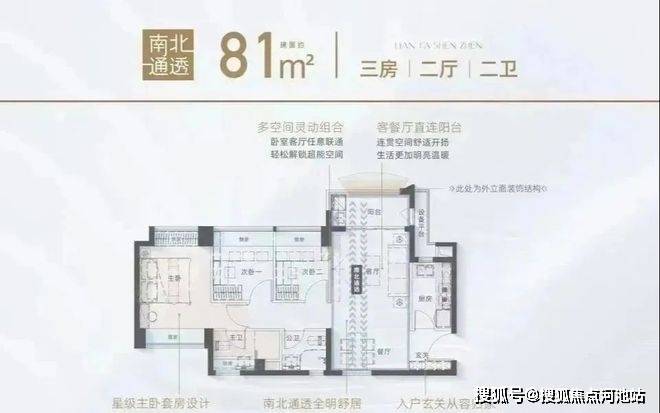 建面约81㎡,独腿户、竖厅、三房两卫,LDK一体化布局,动静分区、室内动线清晰、功能间布局合理,区别于传统竖厅结构,这种布局通风和采光性能更强,动区与主卧可实现双面采光、对流通透,4飘台+1设备平台大幅增加了可使用面积,整体尺度确实是偏紧凑了一些,但在当前的新房市场中80㎡出头能给到三房两卫的属实难得。