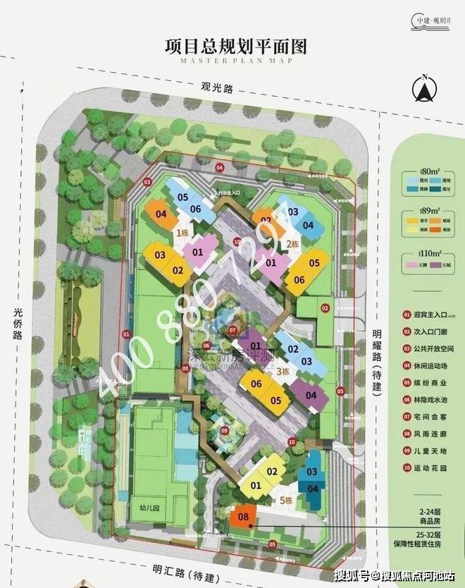 中建观玥总占地面积约1.43万㎡,总建筑面积约11.49万㎡,计容建筑面积约7.91万㎡,容积率5.4,绿化率35.1%,共由4栋总高32-33F住宅组成,其中1/2/3栋商品房33F,5栋商品房+保障房32F,4栋是1所6班制幼儿园。