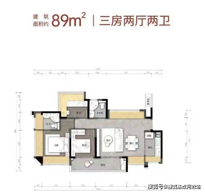 89㎡的3房2厅2卫,设计的是竖厅格局,客厅3.4米开间,LDKB一体化,S墙设计预留冰箱卡槽位,3个卧室分别做到了3.9米/2.9米/2.6米的宽度,客厅连接次卧出6.3米长的大阳台,L型厨房,卫生间干湿分离,有西北、西南或东南朝向。