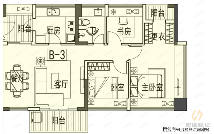 但也需要改动阳台+厨房,才能拥有餐厅空间。
