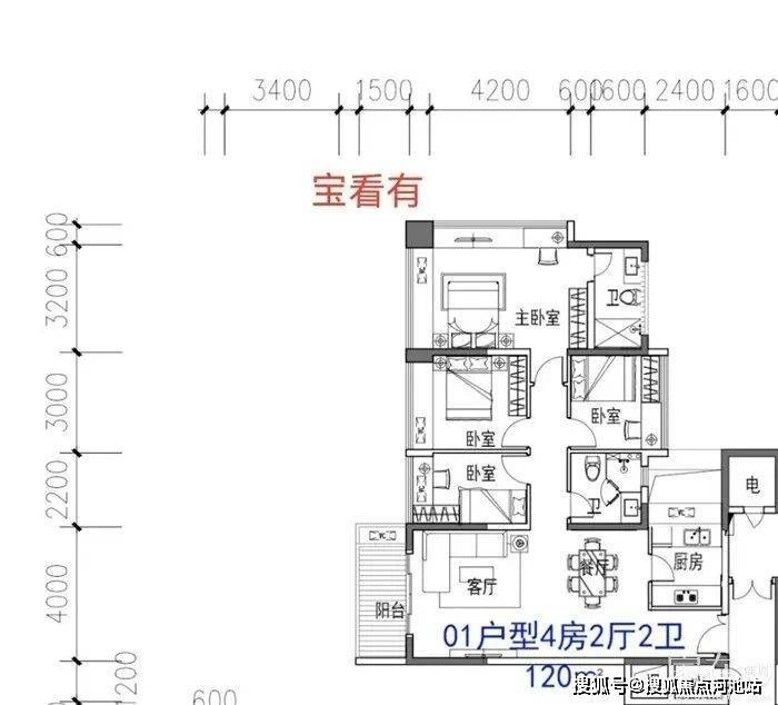 而另一个约118㎡的户型,也是4房1卫。