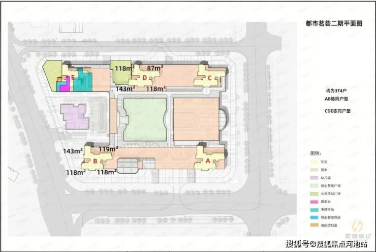 项目占地约3.3万㎡,总建面约20.4万㎡,容积率3.9,由5座高层住宅、2层商业裙楼和1所幼儿园组成。总户数724户,车位900个。