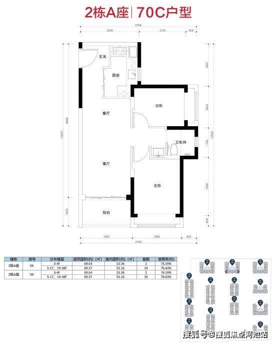 70A为“双龙抱珠”户型,采光面大,卧室、客厅空间舒适性较好;