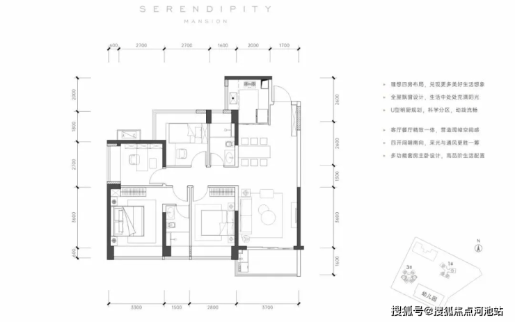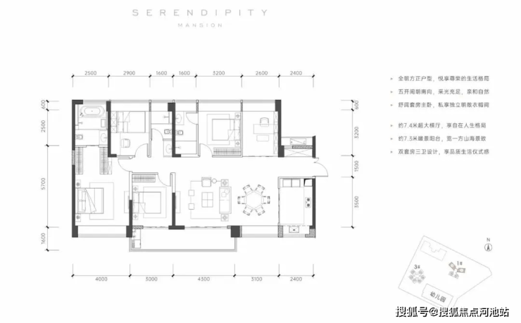 竖厅动静分区户型,分布在3栋的03/06户型,东南和西南两种朝向;所有空间都比较平衡,客厅的开间3.7米,有一间卧室还有270°飘窗,实现双面采光。