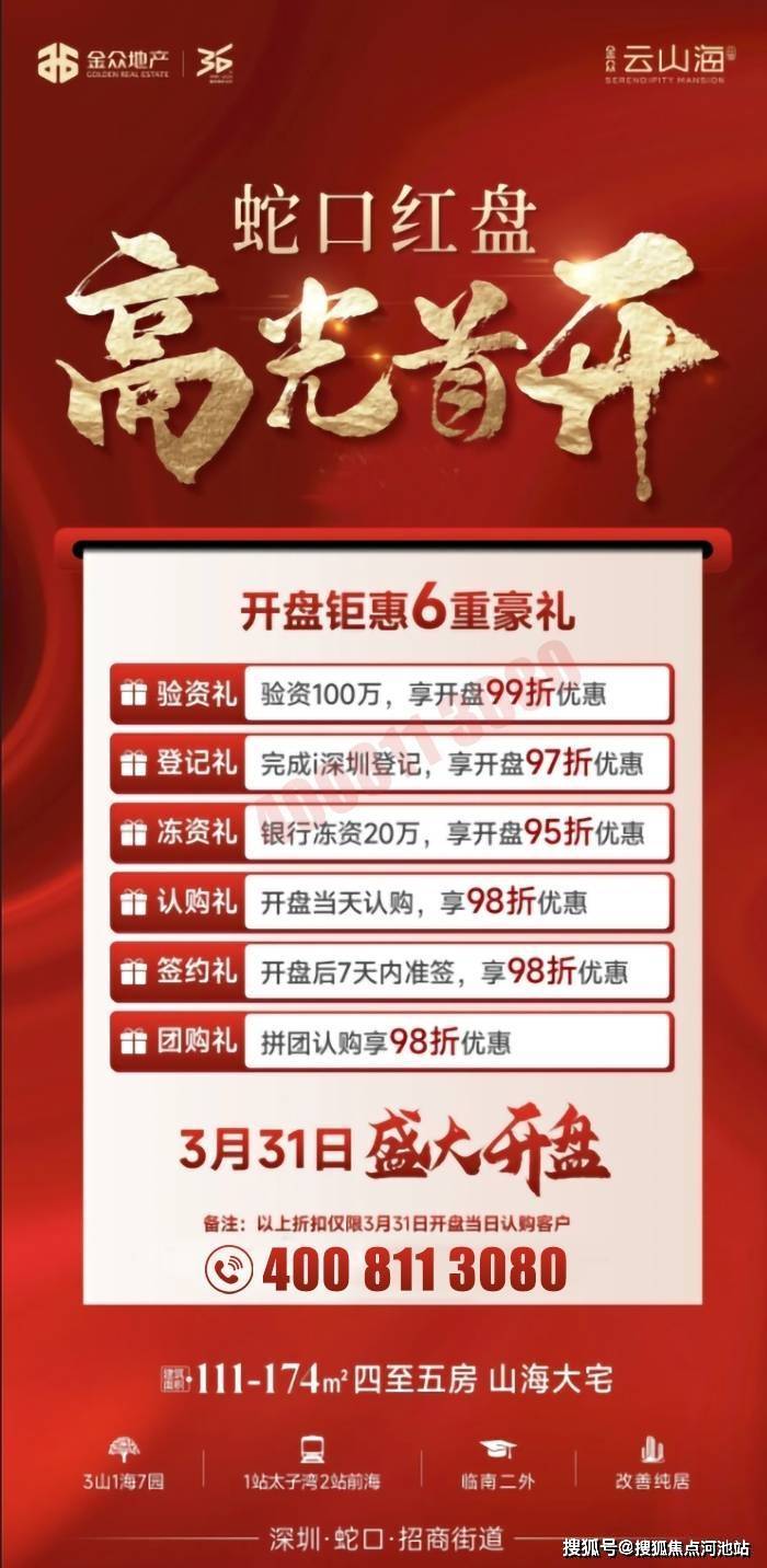 深圳南山蛇口金众云山海楼盘2024年3月26日开始i深圳登记冻资,3月30日公证处摇号,3月31日开盘选房,首期推售西区334套111-174㎡四至五房产品,折后总价732万起买精装修四房,基本相当于周边房价的7折左右,可以说是龙华的价格买蛇口!