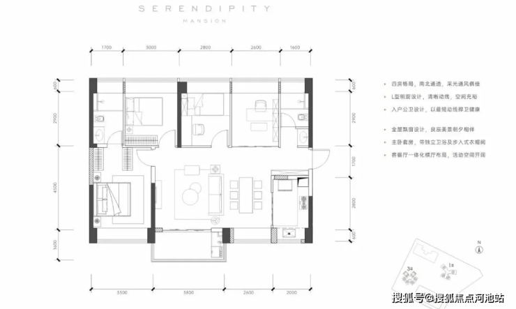 标准的横厅户型,分布在1栋01/02户型,东南、西南朝向;5个房间,2间是套房,带独立卫生间;厨房是 L 型设计,其他竖厅户型厨房都是 U 型设计;采光和空间感非常不错。