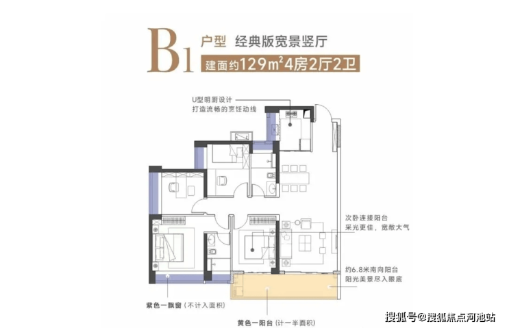 1单元:建面约129㎡四房两厅两卫,B1户型