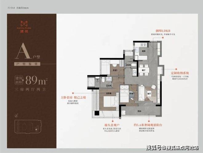 89㎡三房二卫A/B户型,位于1栋一单元,两开间阳台,主卧都有双面凸窗赠送。