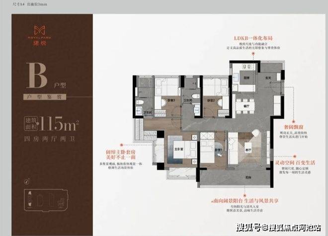 115㎡四房二卫A/B户型,大阳台,主卧通过凸窗赠送衣柜,但次卧尺度都偏小。