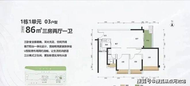 86㎡的3房2厅1卫,1栋1单元03户型,设计的是竖厅格局,客厅3.5米开间,LDKB一体化设计,进深9.95米,主卧全朝南,动静分区,U型厨房,卫生间三段式分离,阳台1.5米进深,东南朝向。