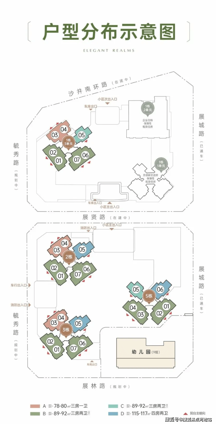 2、3、5栋为纯住宅,总高31-32层,4栋为1所4层2970㎡幼儿园,容积率4.3。