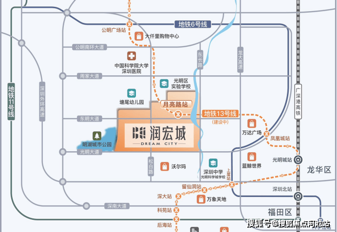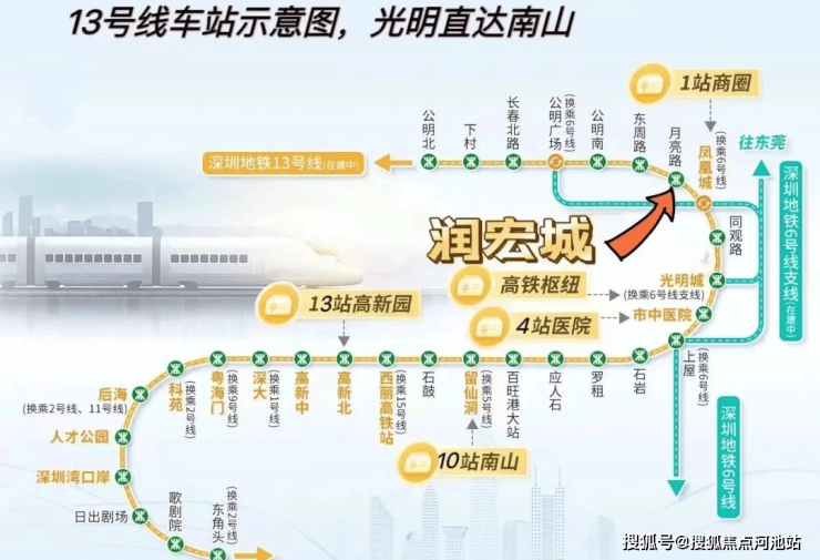 地铁13号线:纵贯光明、宝安、南山三区的深圳南北大动脉”。全期建成后,南接香港、北连东莞,串联光明科学城、南山、科技园、东莞松山湖、深圳湾总部基地等科创总部集群;