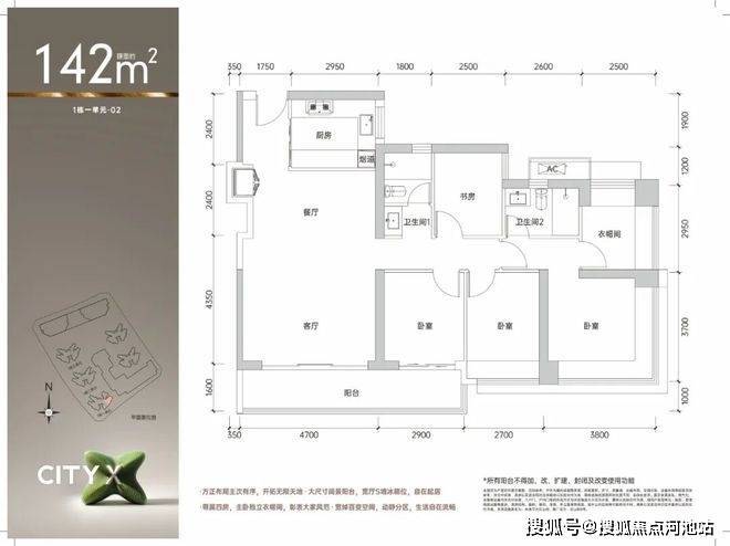 142㎡的4房2厅2卫,1栋1单元02户型,设计的是经典竖厅格局,进门入户玄关,客厅4.7米开间,LDKB一体化,S墙设计预留冰箱卡槽位,四开间朝南,动静分区,4个卧室分别做到了主卧24.03㎡/次卧9.99㎡/次卧8.99㎡/次卧7.6㎡(包含墙体飘窗),U型厨房,公卫三段式分离,得房率约90%(包含赠送),东南朝向。