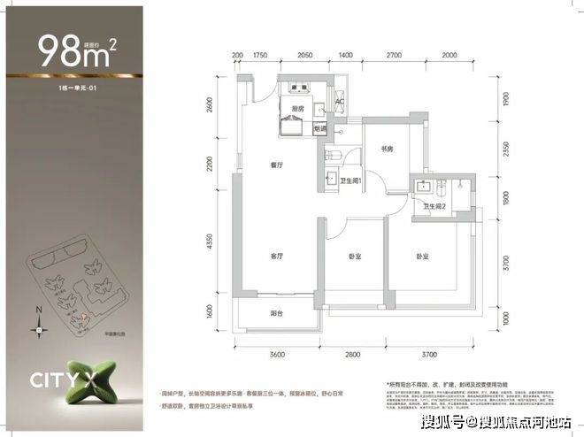 98㎡的3房2厅2卫,1栋1单元01户型,设计的是经典竖厅格局,进门入户玄关,客厅3.6米开间,LDKB一体化设计,动静分区,3个卧室分别做到了主卧14.3㎡/次卧10.36㎡/次卧6.75㎡(包含墙体飘窗),U型厨房,公卫三段式分离,得房率约90%(包含赠送),东北朝向。