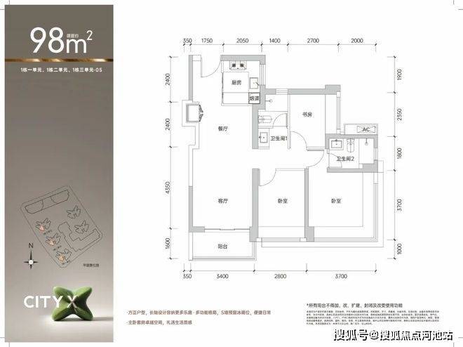 98㎡的3房2厅2卫,1栋1/2/3单元03.05户型,设计的是经典竖厅格局,进门入户玄关,客厅3.4米开间,LDKB一体化,S墙设计预留冰箱卡槽位,三开间朝南,动静分区,3个卧室分别做到了主卧14.3㎡/次卧10.36㎡/次卧6.75㎡(包含墙体飘窗),U型厨房,公卫三段式分离,得房率约90%(包含赠送),东南或西南朝向。