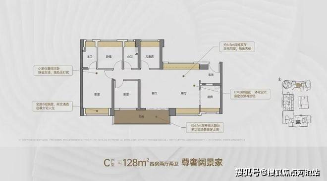 128㎡4房2卫,横厅南北通透,客餐厅开间6.5米,进门户玄关,客厅连接次卧出6.1米长的大阳台,主卧大套间设计,全屋8处飘窗,阳台主朝南向。