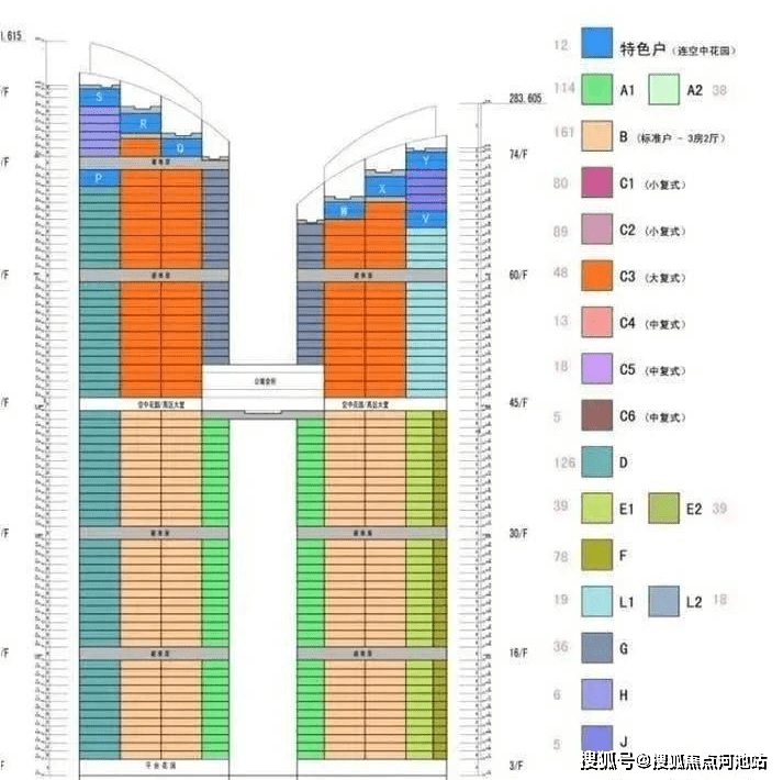 东海国际公寓两座楼最高层单位分别A座82层308 米、B座75层 275 米,是亚洲第一高纯公寓。