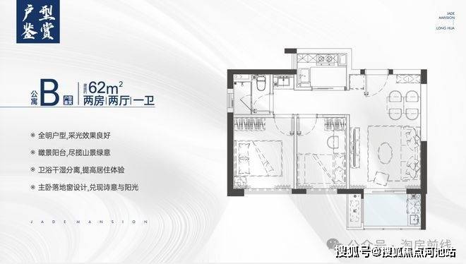 户型面积为47㎡一房两厅一厨一卫,62㎡二房两厅一厨一卫,户型非常方正实用。