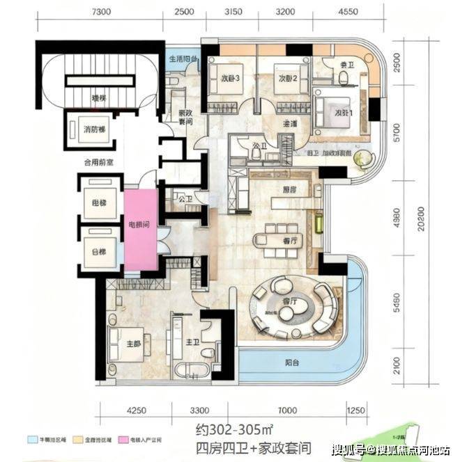 302-305㎡户型,梯户比3梯2户设计。