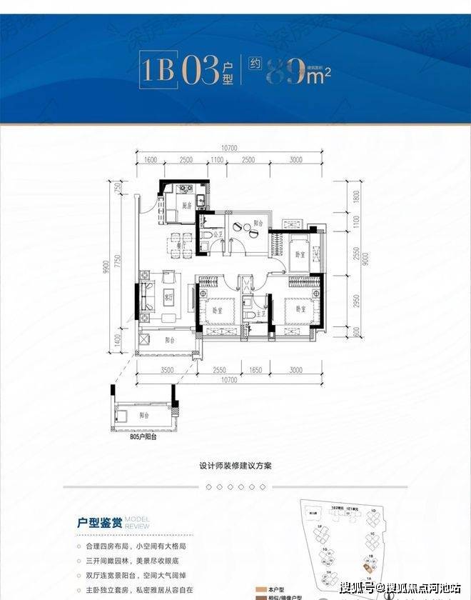 89平4房2卫,竖厅格局,赠送面积约11.85-15.02㎡,加赠送后得房率约93-96.48%。